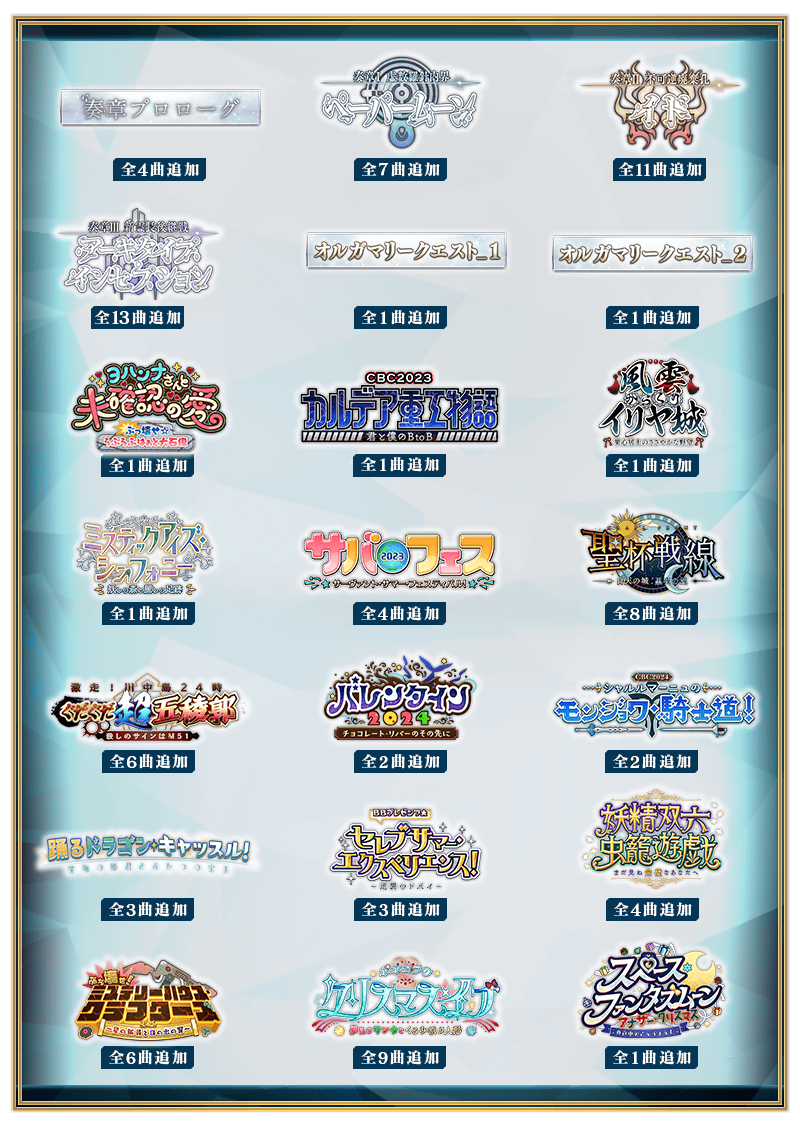 本次新追加的樂曲,到從2023年配信的奏章Ⅲ為止(序幕 「Ordeal Call 序」、「Ordeal Call 0」、「奏章Ⅰ 虛數羅針內界 平面之月」、「奏章Ⅱ 不可逆廢棄孔 本我」、「奏章Ⅲ 新靈長後繼戰 Archetype Inception」)的樂曲為首,2023~24年的舉辦活動等釋出的共89曲。