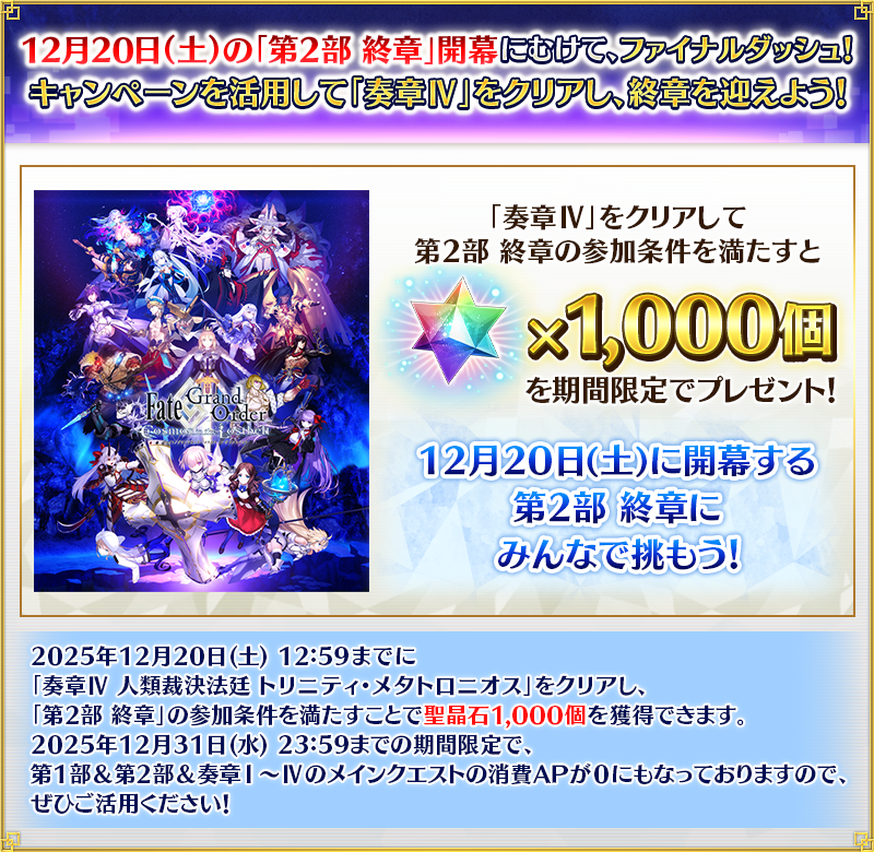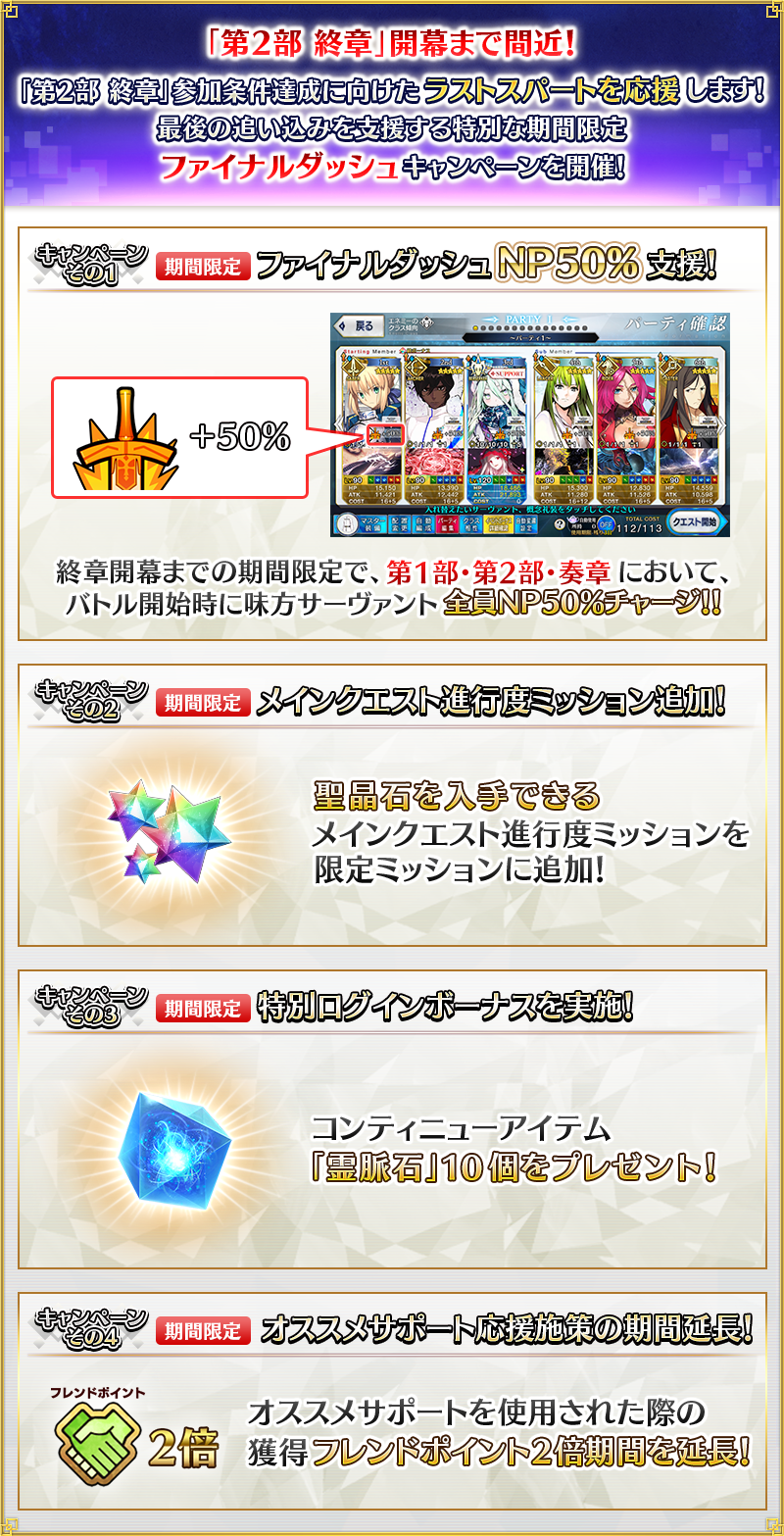 限定 「第2部 終章」開幕為止的特別企劃!奏章Ⅳ為止的主線關卡中在戰鬥開始時NP增加50%!
