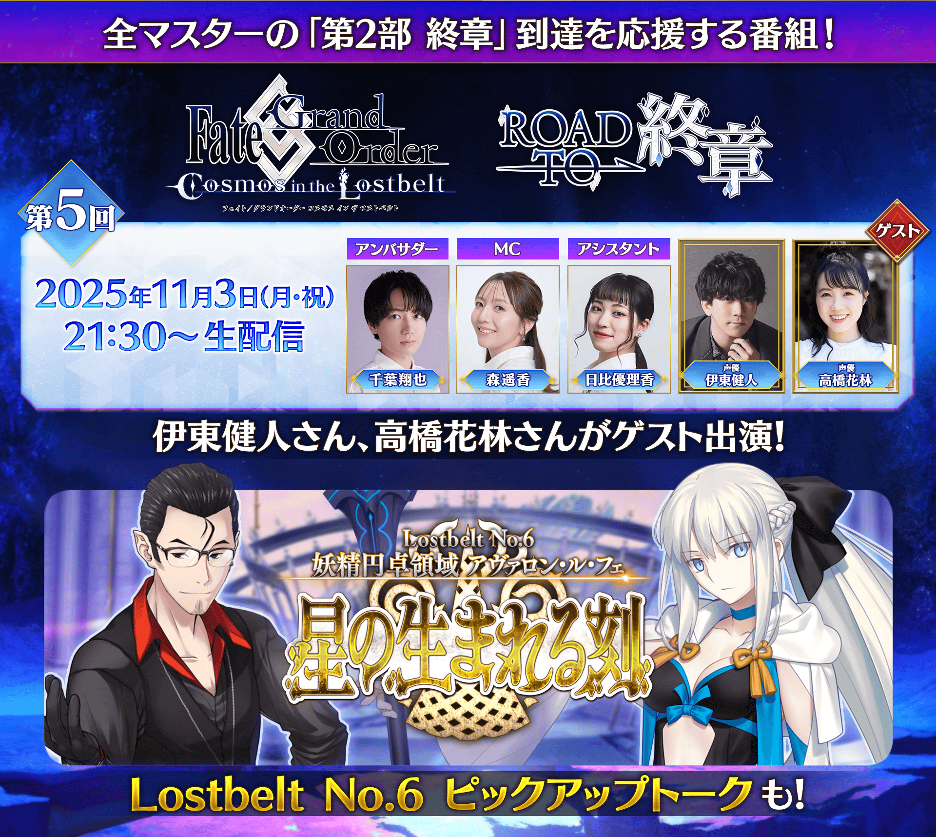 實施跟本次播送中特集的「Lostbelt No.6 妖精圓桌領域 阿瓦隆・勒・菲 星辰誕生之刻」關聯的期間限定聖晶石召喚和自由關卡的初次通過為止消耗AP0!