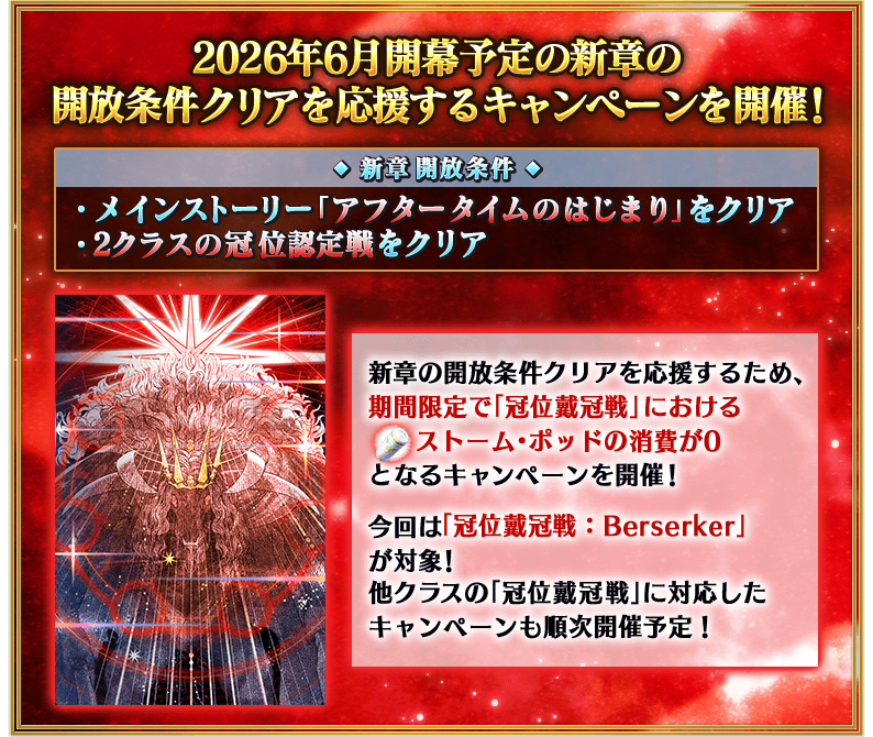 為了記念『新章開放條件通過聲援「冠位戴冠戰:Berserker」Storm Pod消耗0!宣傳活動』的開幕,實施特別次數登入獎勵。