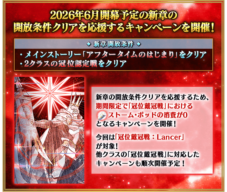 為了記念『新章開放條件通過聲援「冠位戴冠戰:Lancer」Storm Pod消耗0!宣傳活動』的開幕,實施特別次數登入獎勵。