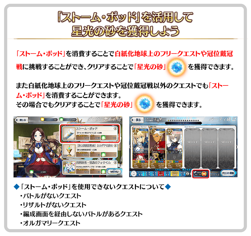 ※「Storm Pod」超過持有上限(9個)無法獲得及交換。 ※靠各任務報酬可入手的「星光之砂」和消耗目前為止「Storm Pod」完全獲得「星光之砂」的玩家,無使用達・文西工房的追加量也可解放所有職階刻痕的星痕。