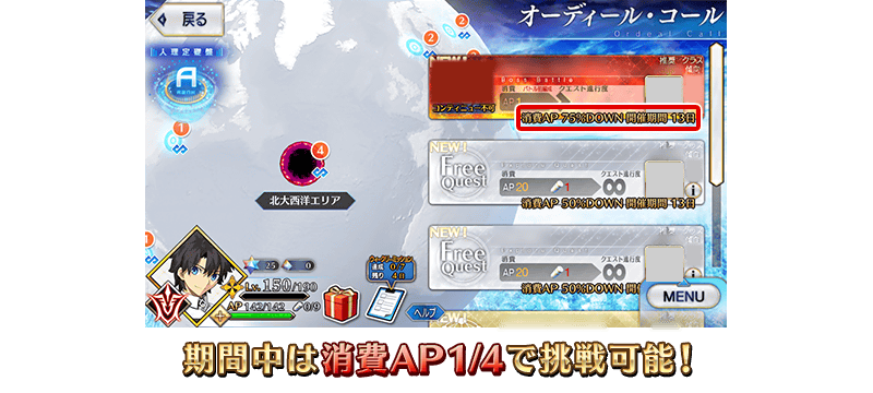 下述的期間中,「奧爾嘉瑪麗關卡_1」「奧爾嘉瑪麗關卡_2」「奧爾嘉瑪麗關卡_3」「奧爾嘉瑪麗關卡_4」的消耗AP變成1/4!(就算在戰鬥中撤退的情況,也會是同様的消耗量)
