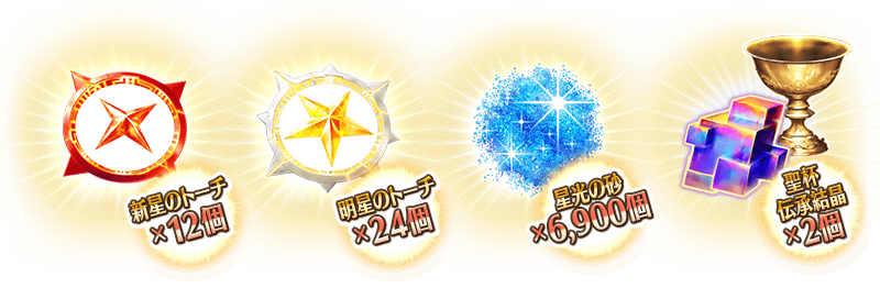 通過所有任務的話合計可獲得聖杯2個、傳承結晶2個、新星火炬12個、明星火炬24個、星光之砂6,900個!