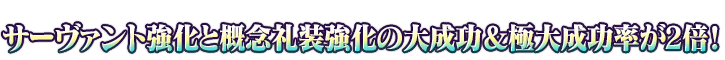 下述的期間中,在進行從者及概念禮裝的強化時,大成功(經驗值2倍加成)・極大成功(經驗值3倍加成)發生機率以期間限定變成2倍!