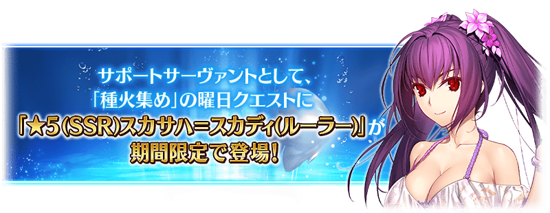 下述的期間中,期間限定で「蒐集種火」的關卡に支援從者與して「★5(SSR)斯卡薩哈=斯卡蒂(Ruler)」登場します!