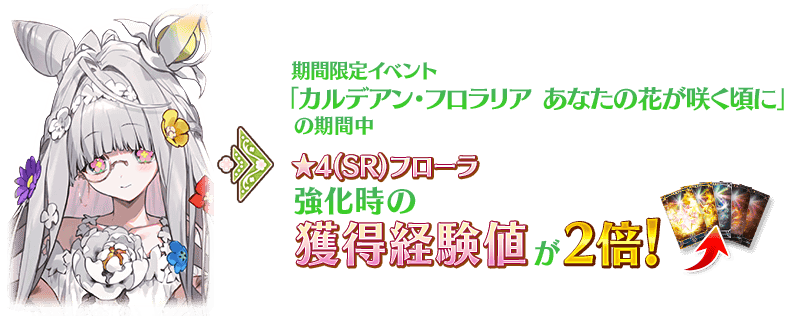 本活動的期間中,強化「★4(SR)芙蘿拉」時的獲得經驗值變成2倍。