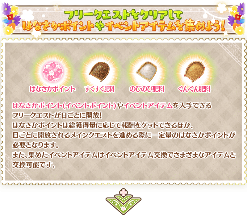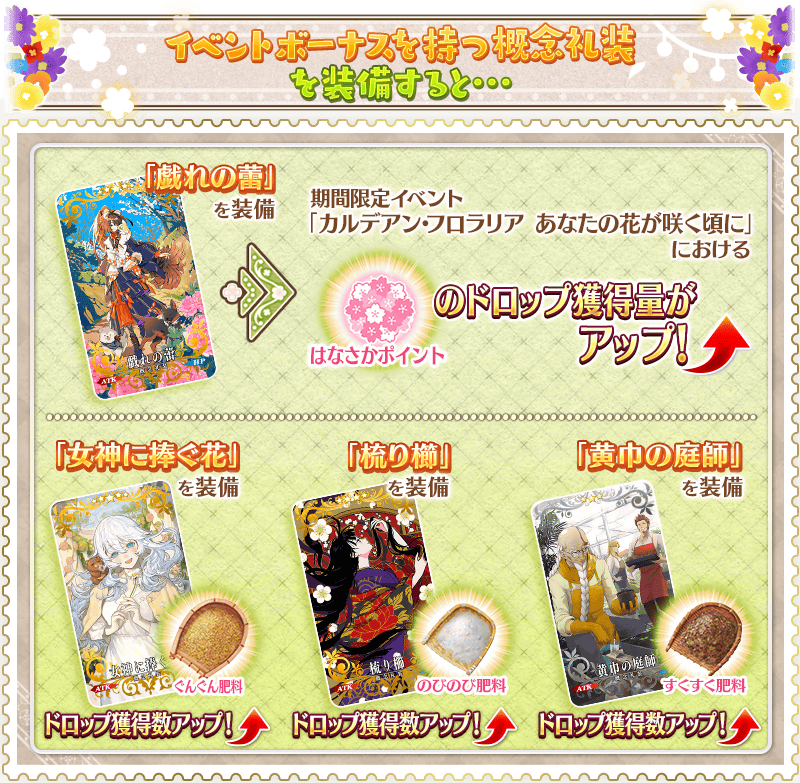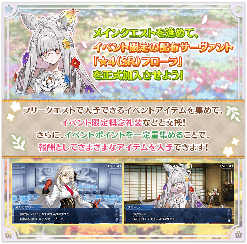 ※「★4(SR)芙蘿拉」的靈基再臨素材「花園的胸花」及寶具強化専用靈基,在通過特定的主線關卡通過後才能交換。 ※關於「★4(SR)芙蘿拉」的從者幣、傳承結晶、英靈結晶・流星之芙芙ALL★4(HP)、英靈結晶・日輪之芙芙ALL★4(ATK),在通過本活動的「主線關卡 後記(エピローグ)」後才能交換。 ※活動道具交換期間結束後「茁壯肥料」「舒展肥料」「順遂肥料」會消失。