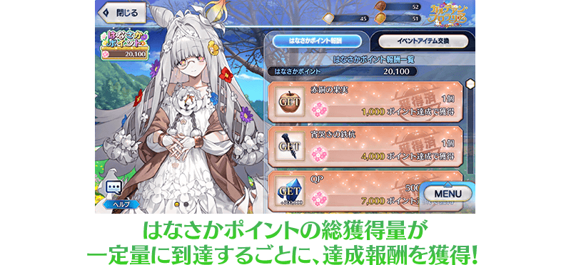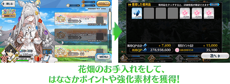 「花開點數」的總獲得量每到達一定量,可獲得各種從者的培育素材外傳承結晶等做為達成報酬。