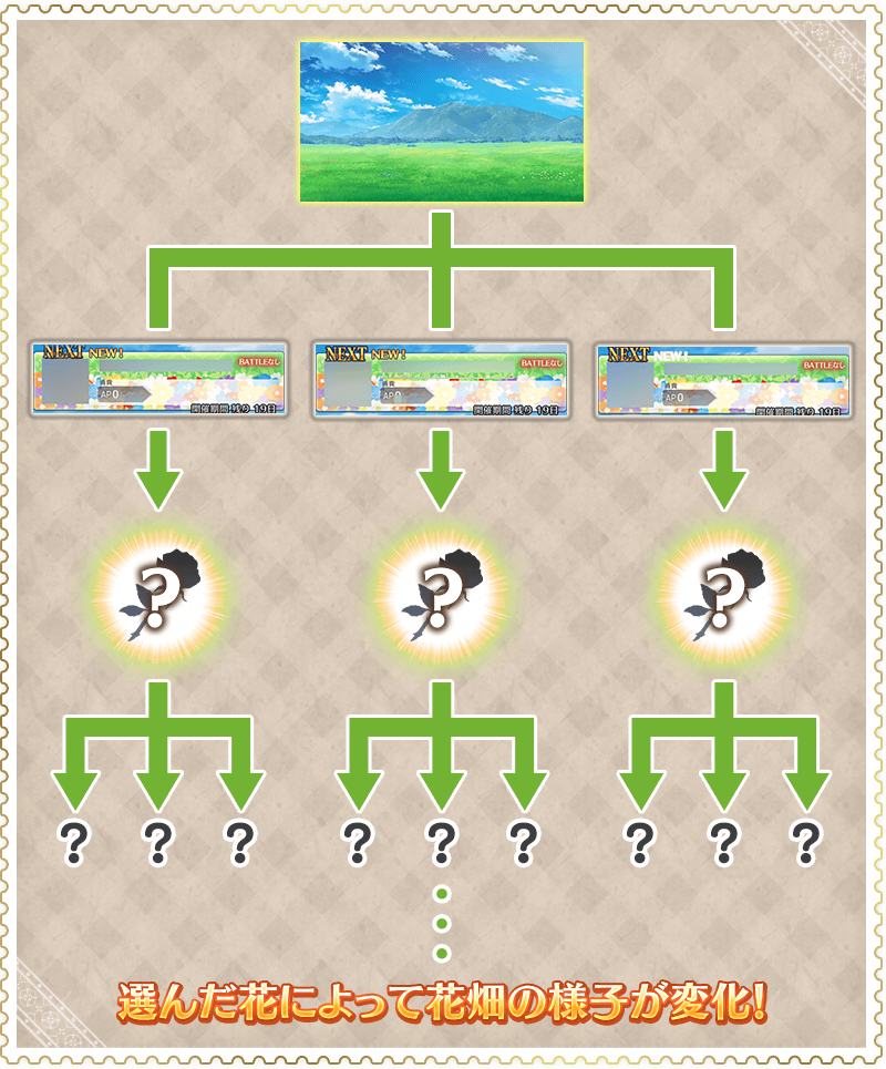 ※「花田製作關卡」為推進日後開放的特定主線關卡後登場。 ※執行「花田製作關卡」的話,剩下未選擇的「花田製作關卡」會消失。 ※通過後記(エピローグ)的話「花田製作關卡」會再次開放,可重新選擇其他的「花田製作關卡」後重新製作花田。