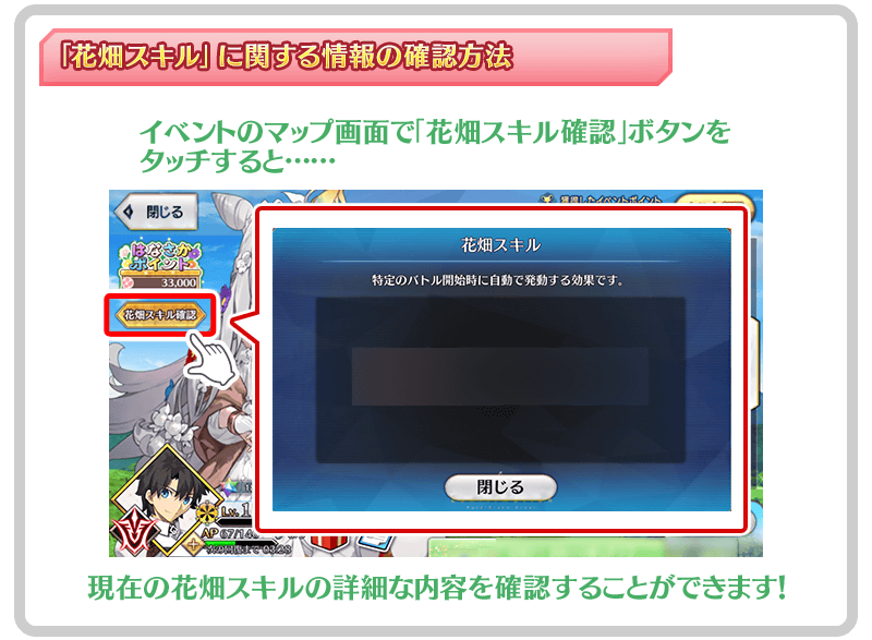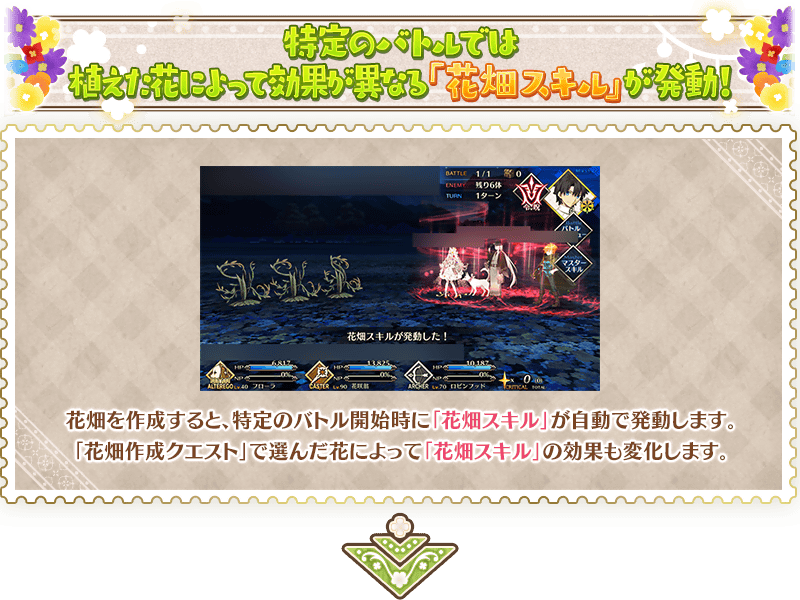 「花田製作關卡」中製作花田的話,在本活動的特定的主線關卡、自由關卡的戰鬥開始時會自動發動「花田技能」。