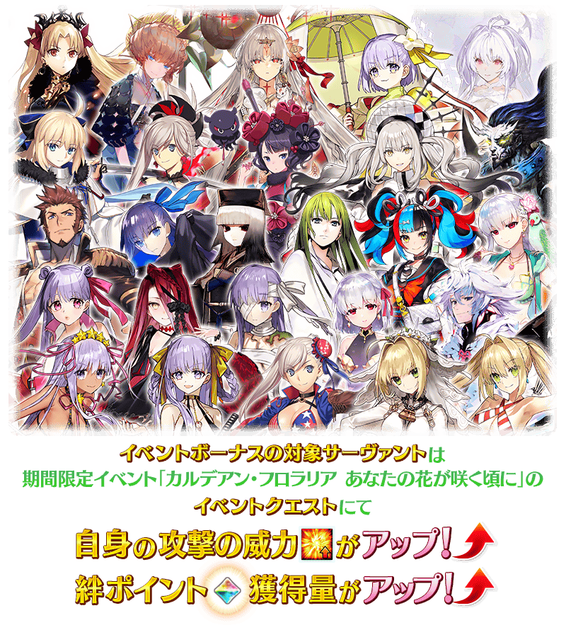 期間限定活動「迦勒底的花神節 當你的花朵綻放時」的期間中,一部份的從者在活動關卡中會得到「自身的攻擊威力提升」與「絆點數獲得量提升」的加成!
