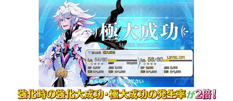 在下述的期間中,在進行活動加成對象從者的強化時,大成功(經驗值2倍加成)・極大成功(經驗值3倍加成)發生機率以期間限定變成2倍!