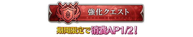 下述的期間中,活動加成從者的「強化關卡」的消耗AP以期間限定變成1/2!(就算在戰鬥中撤退的情況,也會是同様的消耗量)