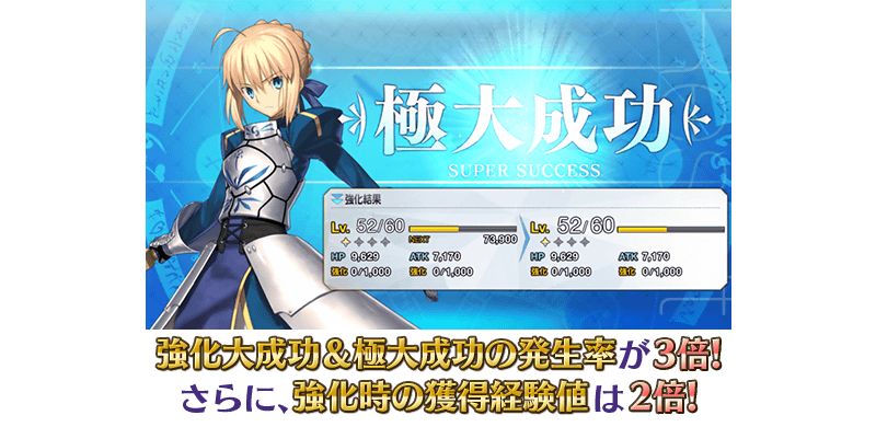 下述的期間中,在進行從者的強化時,大成功(經驗值2倍加成)・極大成功(經驗值3倍加成)發生機率變成3倍!