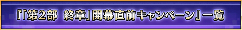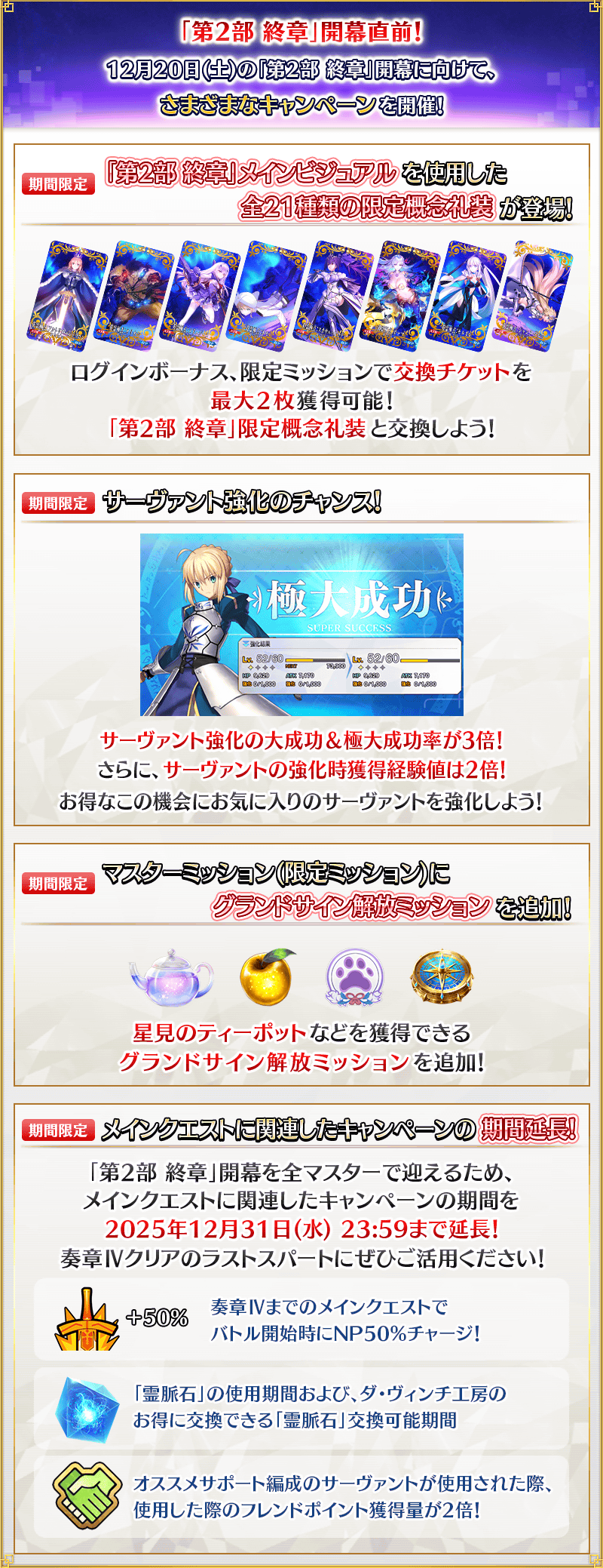 【期間限定】「第2部 終章」限定概念禮裝新追加!用「英靈極點交換券」交換後,能入手2張期間限定概念禮裝! 【期間限定】從者的強化大成功&極大成功率3倍!並且,從者的強化獲得經驗值2倍! 【期間限定】在御主任務(限定任務)追加冠位星痕解放任務! 【期間限定】期間延長!「第2部 終章」開幕為止的特別企劃!奏章Ⅳ為止的主線關卡中在戰鬥開始時NP增加50%! 【期間限定】接關道具「靈脈石」的使用期間及可在達・文西工房的實惠交換的「靈脈石」能交換期間延長! 【期間限定】期間延長!推薦支援編制的從者被使用時,使用時的友情點數獲得量2倍! 【永久】在圖鑑(陳列室)追加過去的活動關卡!