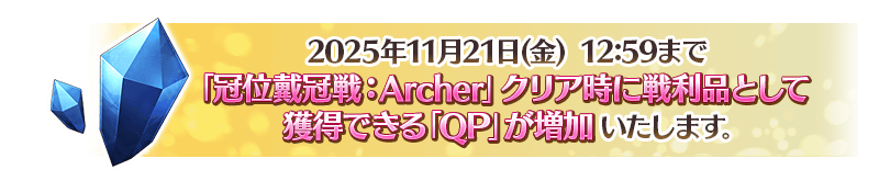 ※可做為戰利品獲得的QP增加為本次限定,2025年11月21日(五) 12:00以後的「冠位戴冠戰:Archer」和再次變得可無消耗「Storm Pod」挑戰的情況,戰利品的「QP」不會增加。