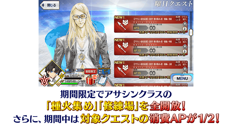 限定 Assassin職階的「蒐集種火」「修練場」全開放&消耗AP1/2!