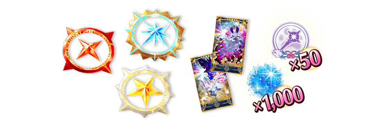通過任務的話可獲得聖晶石3個、英靈結晶・終局之芙芙ALL★5(HP)1張、英靈結晶・原初之芙芙ALL★5(ATK)1張、英靈結晶・流星之芙芙ALL★4(HP)1張、英靈結晶・日輪之芙芙ALL★4(ATK)1張、睿智的業火ALL★5(SSR)20張、術階銀像15個、術階金棋9個、術之輝石15個、術之魔石9個、術之秘石6個!