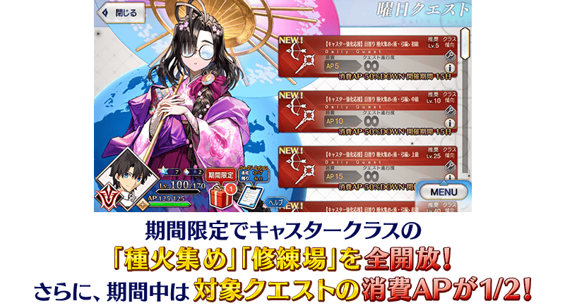 限定 Caster職階的「蒐集種火」「修練場」全開放&消耗AP1/2!