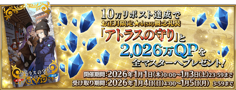 在官方X(Twitter),2026年1月1日(四)・2日(五)・3日(六)的的當日23點投稿的「2026年新年宣傳活動舉辦!」貼文的轉貼數。於下述的期間內合計達成10萬轉貼的話,會向所有遊玩遊戲的御主贈送概念禮裝「★4(SR)アトラスの守り」與2,026萬QP!