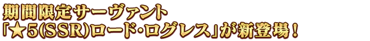 下述的期間中,「★5(SSR)君主・羅格雷斯」以期間限定在「蒐集種火」、「修練場」的一部份關卡做為支援從者的登場!