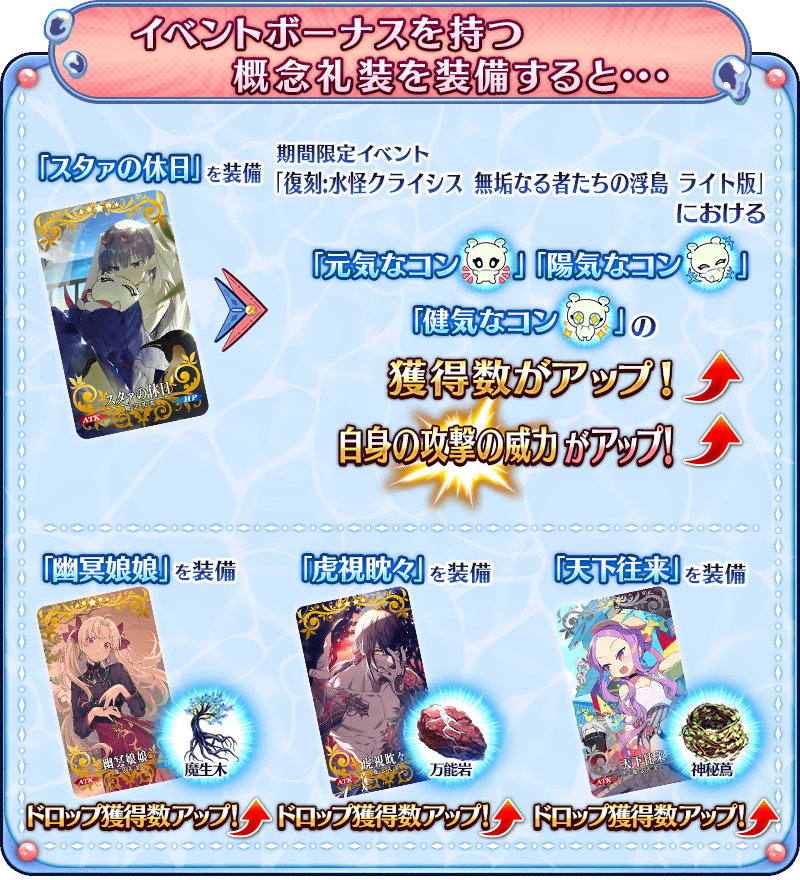 本活動的期間中,活動加成對象從者以外的的所有從者,根據對應職階「健康的涳」「開朗的涳」「勇敢的涳」任一的獲得數量將提升。