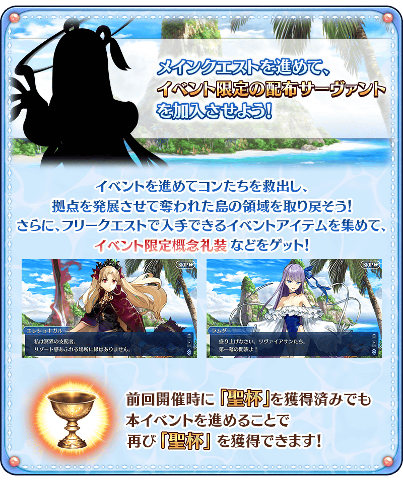 ※就算在上次舉辦時的期間限定活動「水怪危機 純潔之人的浮島」已獲得「聖杯」的情況,推進本活動後也可再度獲得「聖杯」。
