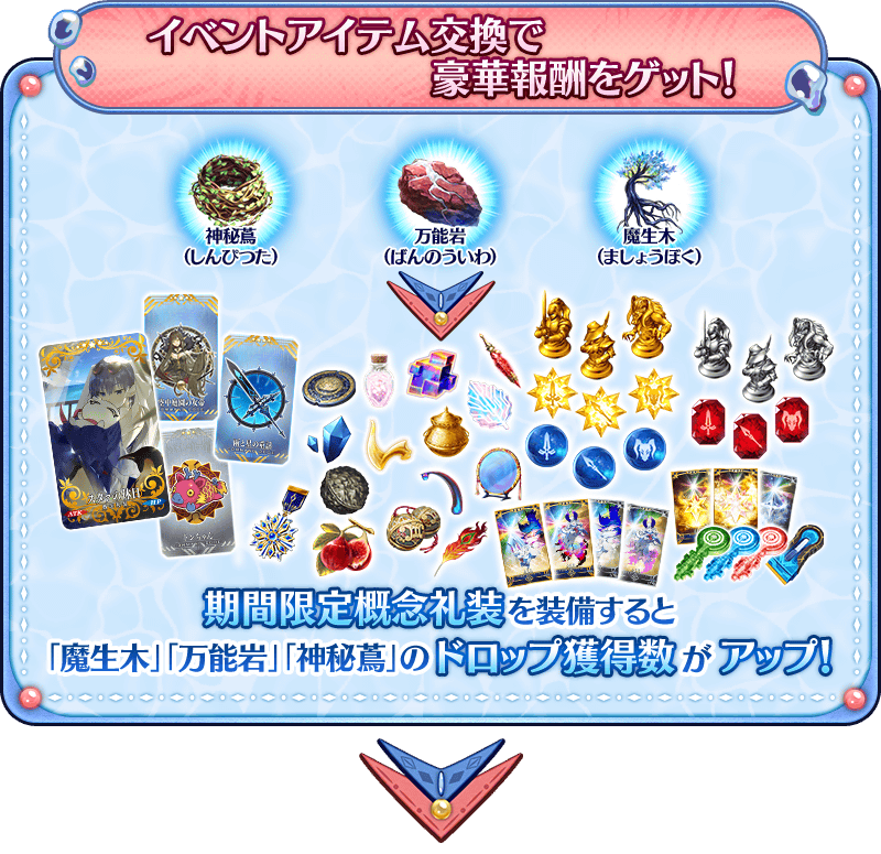 【活動限定概念禮裝】 【活動報酬指令紋章】 【技能強化&靈基再臨素材】 【技能強化素材】 【其他道具】 |