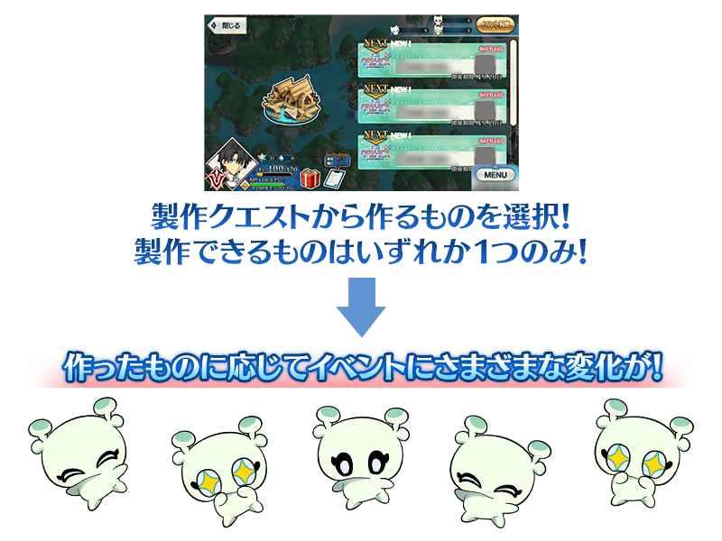 根據在製作關卡中製作的物品,在此之後的文字冒險部份的一部份內容和活動地圖將會發生變化。