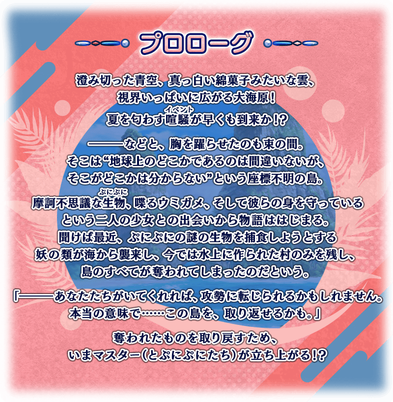 ※本活動是再調整在2022年舉辦的期間限定活動「水怪危機 純潔之人的浮島」一部份使之更容易遊玩的「復刻輕量版活動」。 ※一部份的關卡為日後開放。 ※在2018年12月31日(二) 23:00以後新配信的主線故事及期間限定活動、一部份關卡、宣傳活動及召喚中,會顯示隱藏真名的對象從者真名。 ※從2026年4月9日(四) 12:00在「圖鑑(陳列室)」追加本活動的事件CG和影片。 ※本頁面皆為開發中圖片。會有與實際圖片相異的情況。