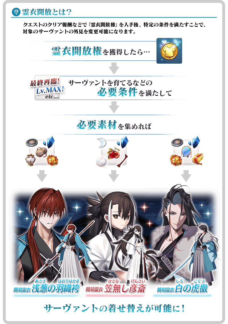 ※對象的靈衣開放權只限期間限定活動「幕末交鋒神話 嘮嘮叨叨新選組・THE・END REVENGE OF MAKOTO」的活動舉辦期間才能入手。 ※對象的靈衣會隨著外觀變化一部份語音。 ※請注意未持有對象靈衣開放權的對象從者情況,可入手靈衣開放權,但無法進行靈衣開放。