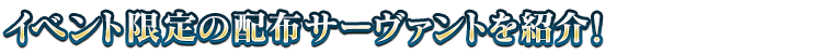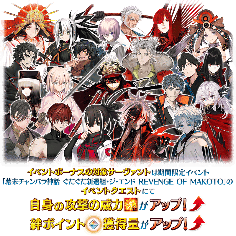 ※就算成為對象從者也會有未在本活動的主線劇本登場的情況。 ※瑪修・基利艾拉特的「絆點數獲得量提升」效果,是所謂「我方全體含候補的絆點數獲得量提升」的效果。支援時此效果無效。 ※自9月18日(四) 17:00,在從者選擇畫面和從者強化畫面等,追加活動加成篩選器。由於是只顯示於活動活躍從者的便利功能,敬請也配合此處活用。 ※「★5(SSR)魔王信長(織田信長)」及「★5(SSR)武田信玄(武田晴信)」是「★5(SSR)織田信長」「★5(SSR)武田晴信」靈基再臨到第3階段後名稱會變成「★5(SSR)魔王信長」「★5(SSR)武田信玄」。