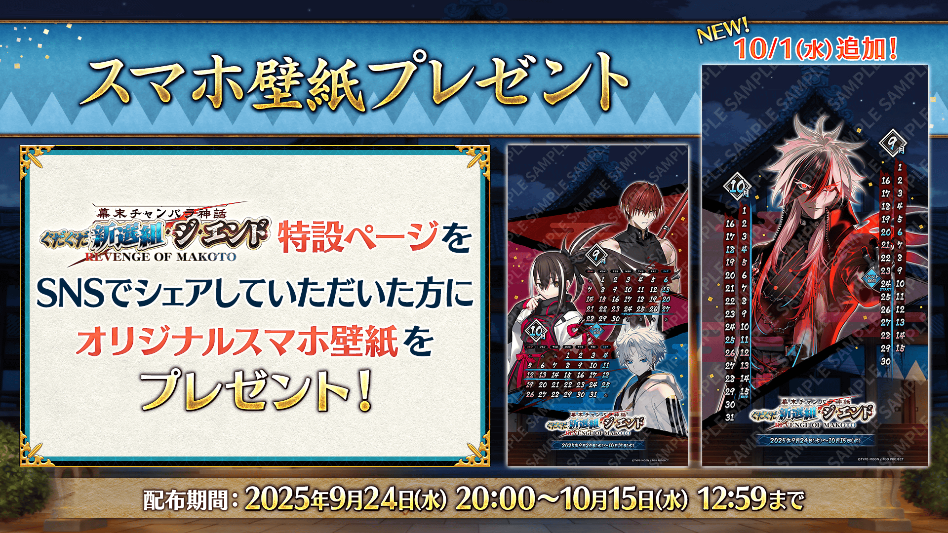 在期間限定活動「幕末交鋒神話 嘮嘮叨叨新選組・THE・END REVENGE OF MAKOTO」的特設頁面,智慧型手機用桌布的贈送實施中!