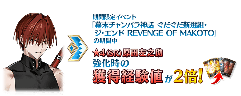 本活動的期間中,強化「★4(SR)原田左之助」時的獲得經驗值變成2倍。