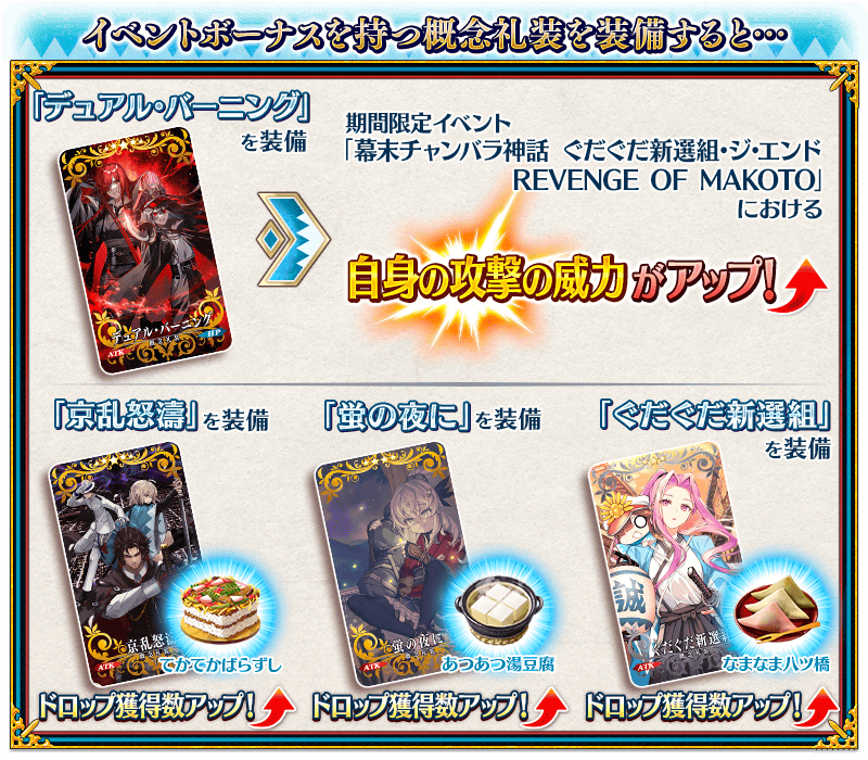 做為期間限定活動「幕末交鋒神話 嘮嘮叨叨新選組・THE・END REVENGE OF MAKOTO」的活動限定的報酬,可入手能大幅強化概念禮裝的EXP卡!