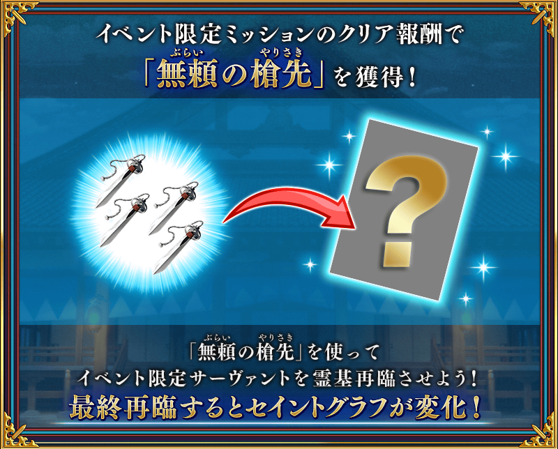 做為活動限定任務的通過報酬,可入手原田左之助的靈基再臨必須的「無賴的槍尖」。