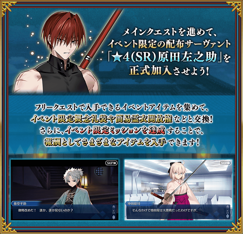 推進主線關卡後,活動限定的配布從者「★4(SR)原田左之助」會正式加入。