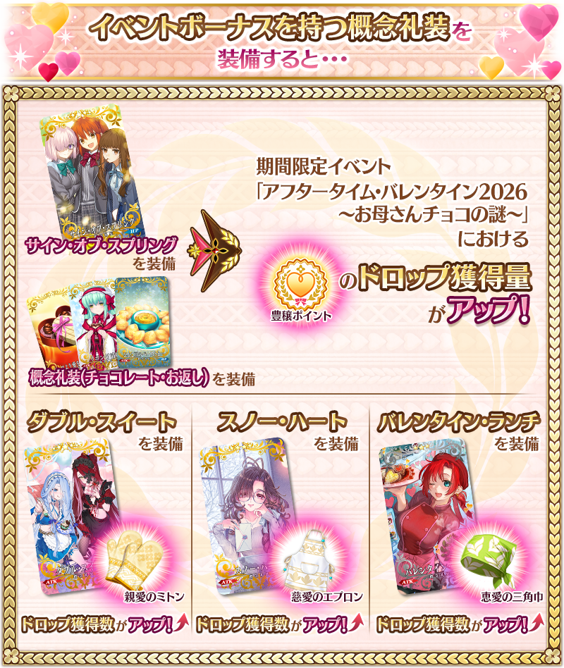 期間限定活動「將來的情人節2026 ~媽媽巧克力之謎~」的期間中,一部份的從者在活動關卡中會得到「自身的攻擊威力提升」與「絆點數獲得量提升」的加成!