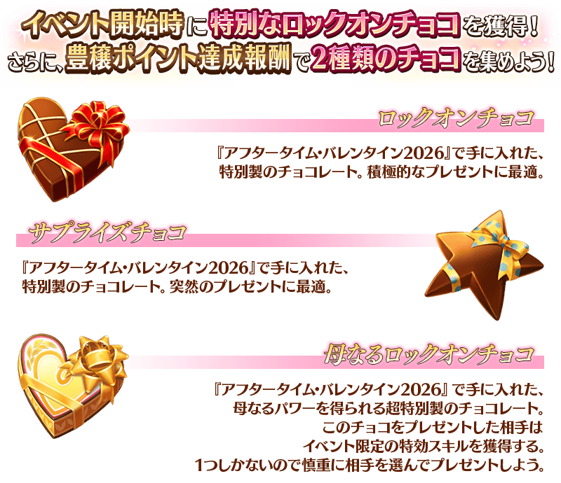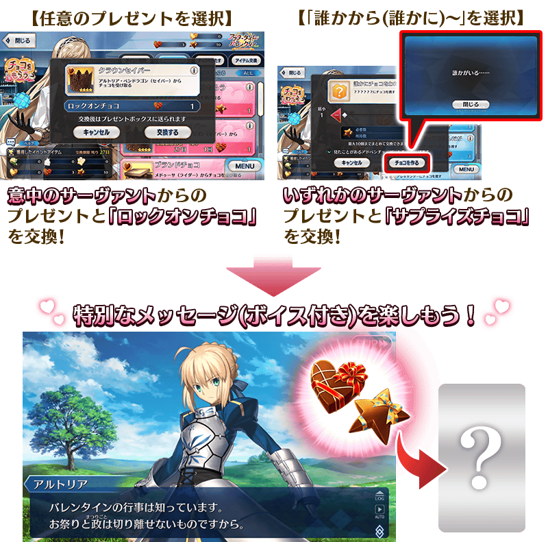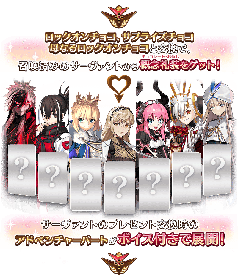 ※「鎖定巧克力」與「驚喜巧克力」在交換禮物時的事件內容及可入手的概念禮裝沒有差異。 ※「收下巧克力」「送出巧克力」最多可一次交換10個為止。 ※請注意可領取巧克力・回禮(概念禮裝)的從者,只限有召喚履歷的從者。沒有召喚履歷的者為對象外。 ※就算持有於2025年以前的活動入手的巧克力・回禮(概念禮裝)情況,還是可發生收下禮物的事件,即使是持有同樣的禮物也能持有不只一個。