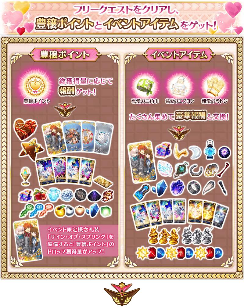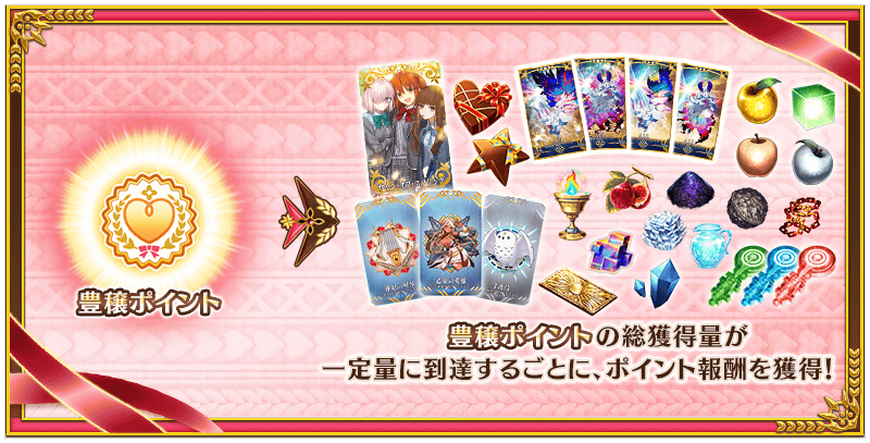 挑戰活動關卡來收集「豐壤點數」,入手活動交換道具「鎖定巧克力」「驚喜巧克力」,收下來自從者的概念禮裝(巧克力・回禮)吧!