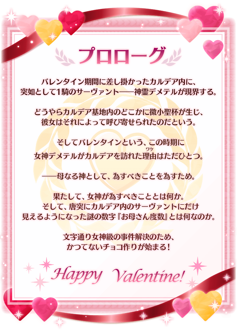 為了回收在迦勒底基地內產生的微小聖杯,與女神狄蜜特一起做出最強的媽媽巧克力吧!