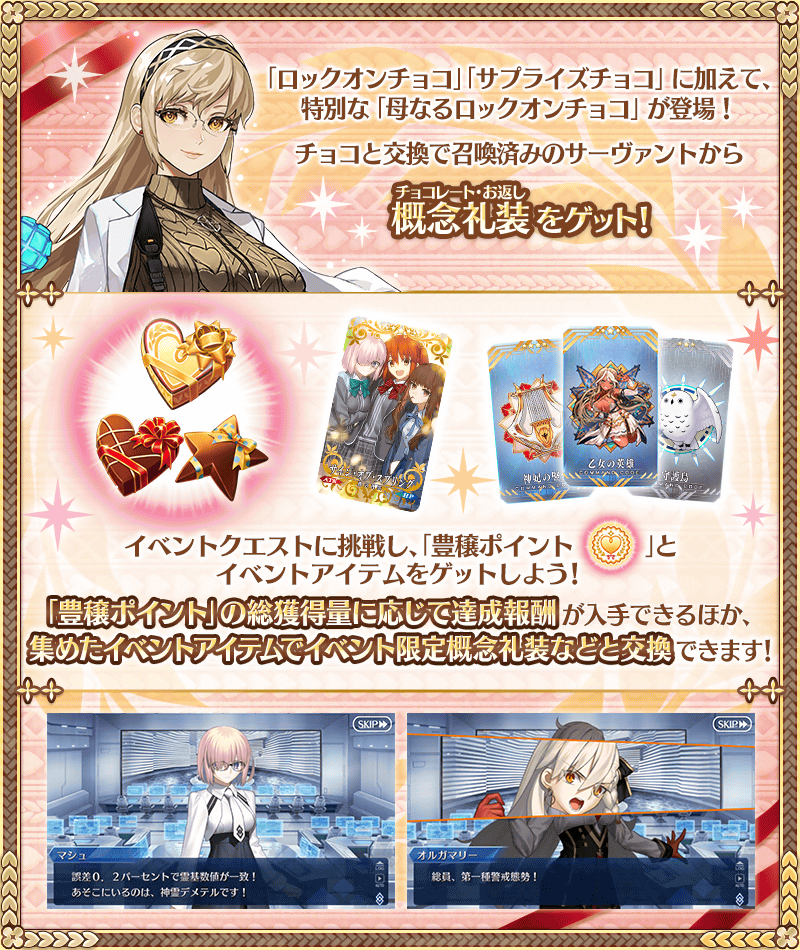 並且,「媽媽般的鎖定巧克力」交換成巧克力概念禮裝(巧克力・回禮)的話,限在本活動期間中可對送出巧克力的從者賦予活動限定的特效技能「媽媽般的包容之力〔Quick〕 EX」「媽媽般的献身之力〔Arts〕 EX」「媽媽般的情熱之力〔Buster〕 EX」的任一。