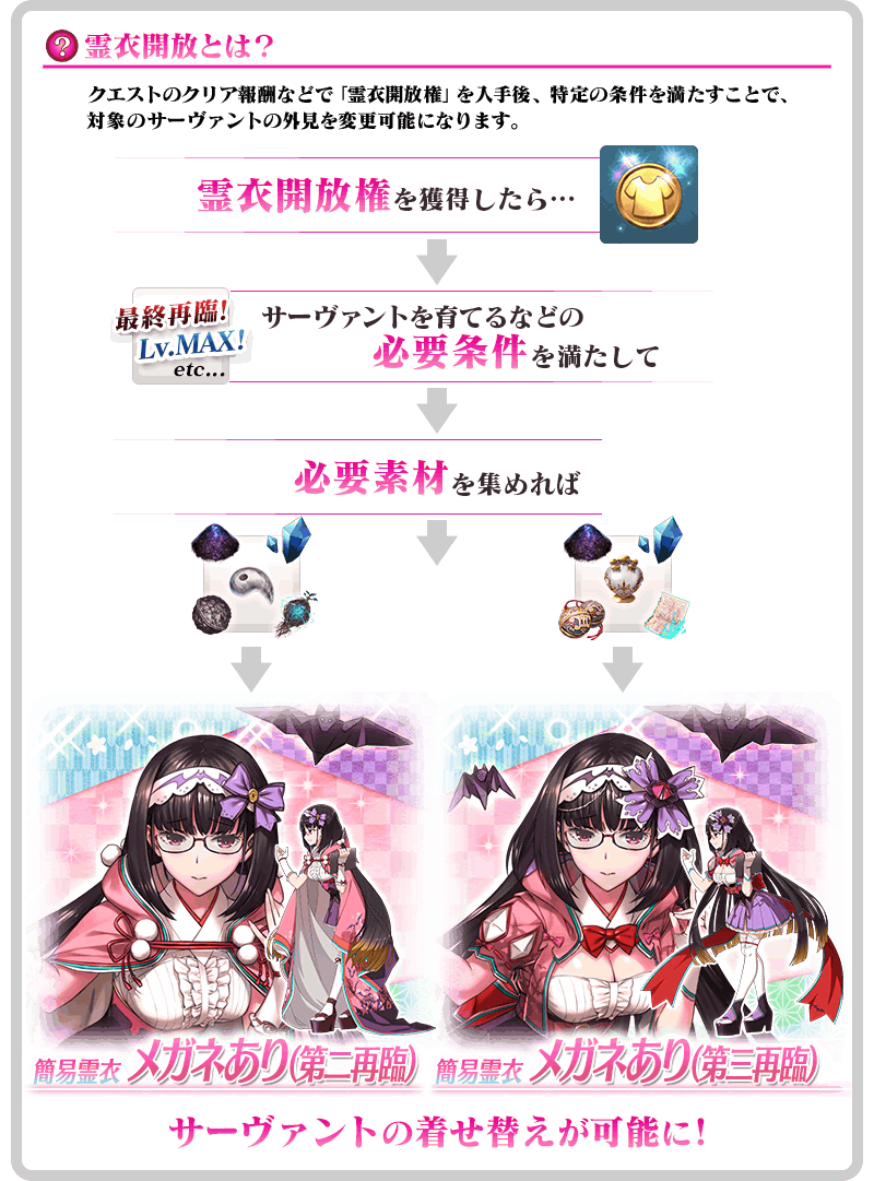 ※追加到「靈衣縫製」的簡易靈衣「配有眼鏡(第二再臨)」「配有眼鏡(第三再臨)」的開放權為永久,沒有交換期限。 ※請注意未持有對象靈衣開放權的對象從者情況,可入手靈衣開放權,但無法進行靈衣開放。 ※「★5(SSR)刑部姬(Assassin)」的靈衣「配有眼鏡(第二再臨)」「配有眼鏡(第三再臨)」是只變化外觀,語音未變化的「簡易靈衣」。