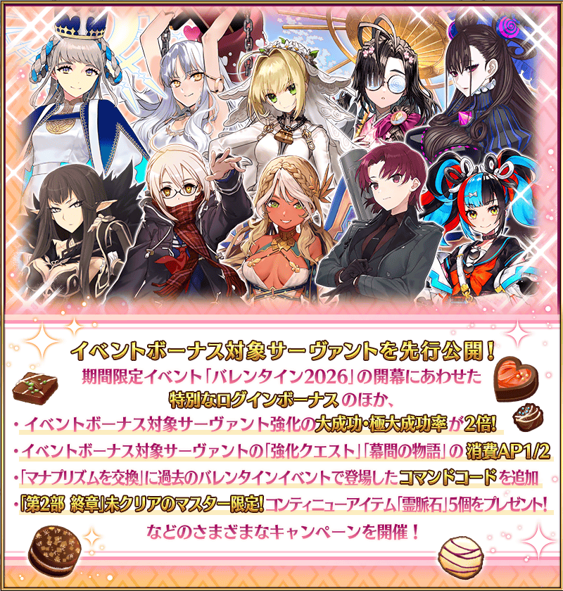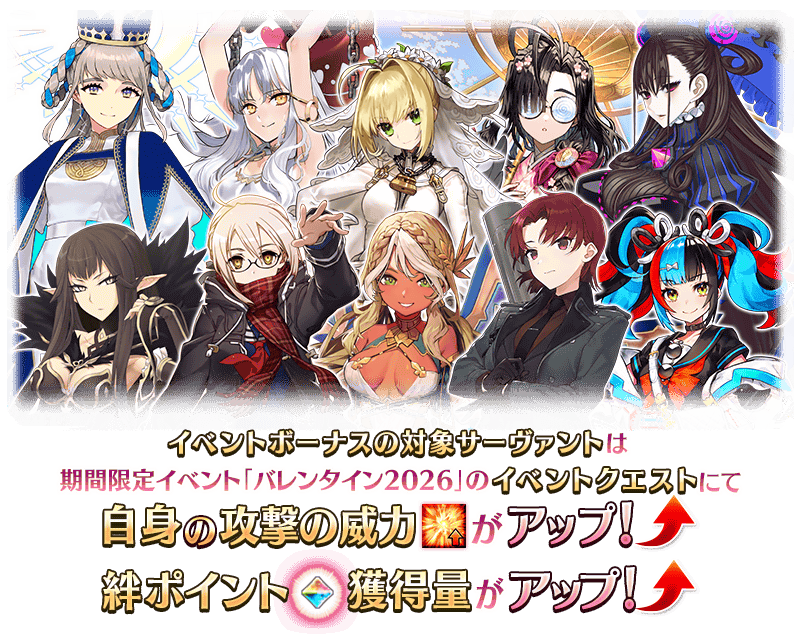 期間限定活動「情人節2026」的期間中,一部份的從者在活動關卡中會得到「自身的攻擊威力提升」與「絆點數獲得量提升」的加成!
