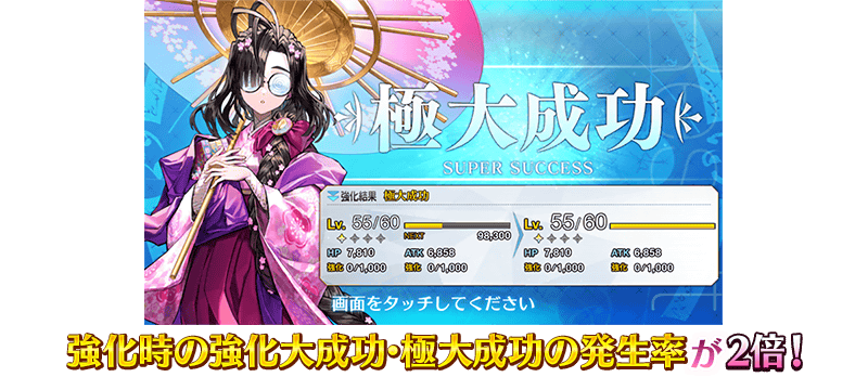 在下述的期間中,在進行活動加成對象從者的強化時,大成功(經驗值2倍加成)・極大成功(經驗值3倍加成)發生機率以期間限定變成2倍!
