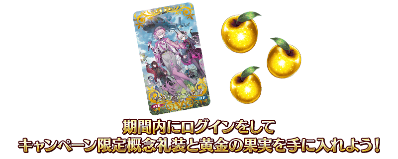 在下述期間中登入3次(1天算1次)的話,贈送最多宣傳活動限定概念禮裝「★4(SR)サテライトステーション26」、黃金果實3個!