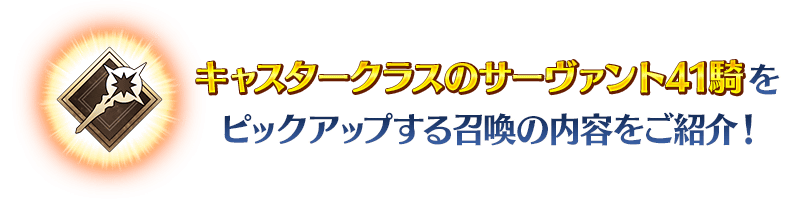 ※確定★4(SR)以上包含從者和概念禮裝。 ※請注意Caster職階以外的從者也會抽出。 ※在2018年12月31日(二) 23:00以後新配信的主線故事及期間限定活動、一部份關卡、宣傳活動及召喚中,會顯示隱藏真名的對象從者真名。