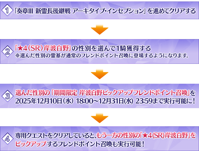 ※能施行在通過「奏章Ⅲ 新靈長後繼戰 Archetype Inception」時獲得性別的召喚。男女雙方的「★4(SR)岸波白野」成為平常友情點數召喚的抽出對象的情況可施行雙方的召喚。