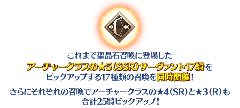 在預2025年11月14日(五)開幕的「冠位戴冠戰:Archer」之前,同時舉辦目前為止的聖晶石召喚登場的包含期間限定從者的42位Archer職階Pick Up的17種召喚!